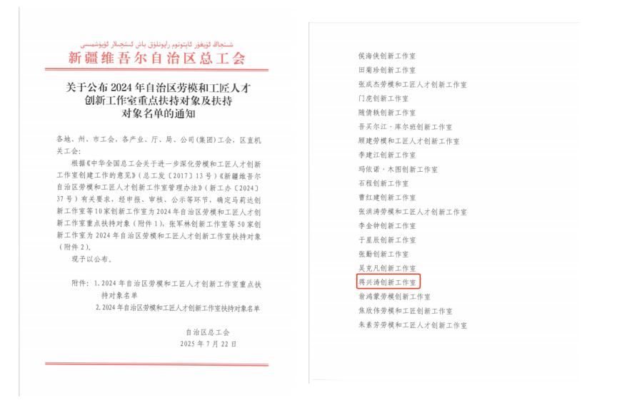 喜訊!“蔣興濤創新工作室”成功入選2024年自治區勞模和工匠人才創新工作室扶持名單?